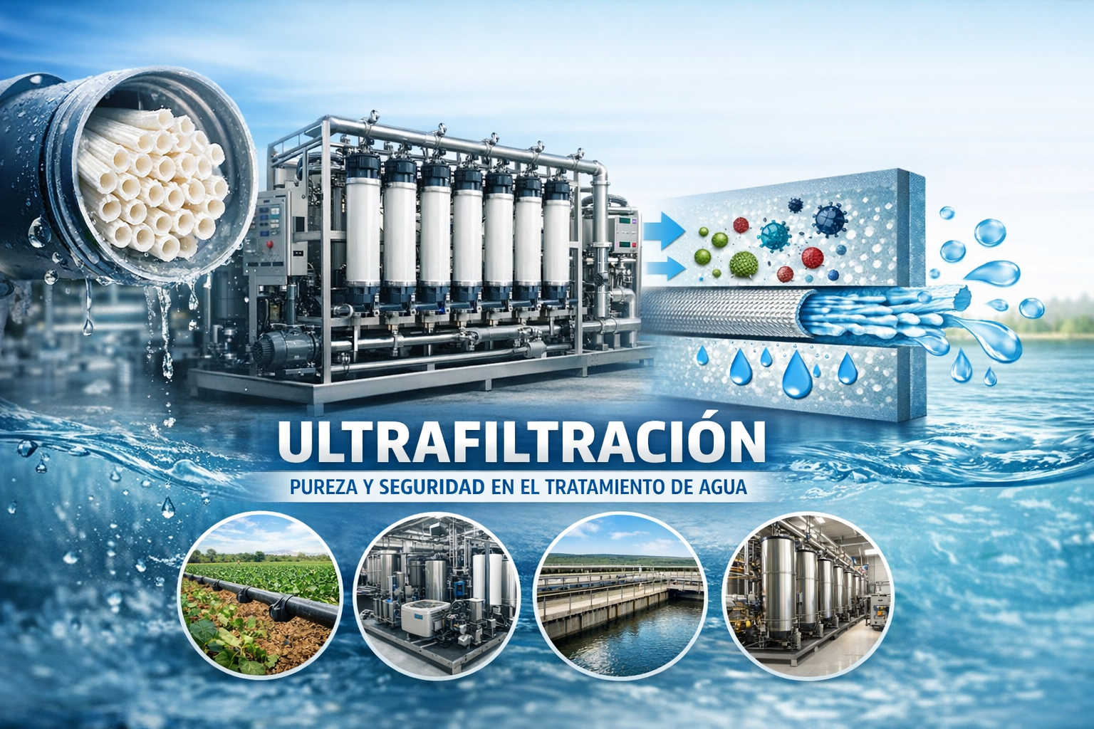 La ultrafiltración (UF) es una tecnología de separación por membrana diseñada para eliminar sólidos en suspensión, bacterias, virus y materia orgánica coloidal mediante una barrera física con tamaños de poro entre 0,01 y 0,1 micras.